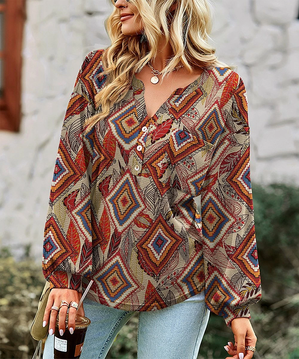 Spruce up you casual collection with this front-button top that showcases a bold print, chest pocket and notch-neck collar.