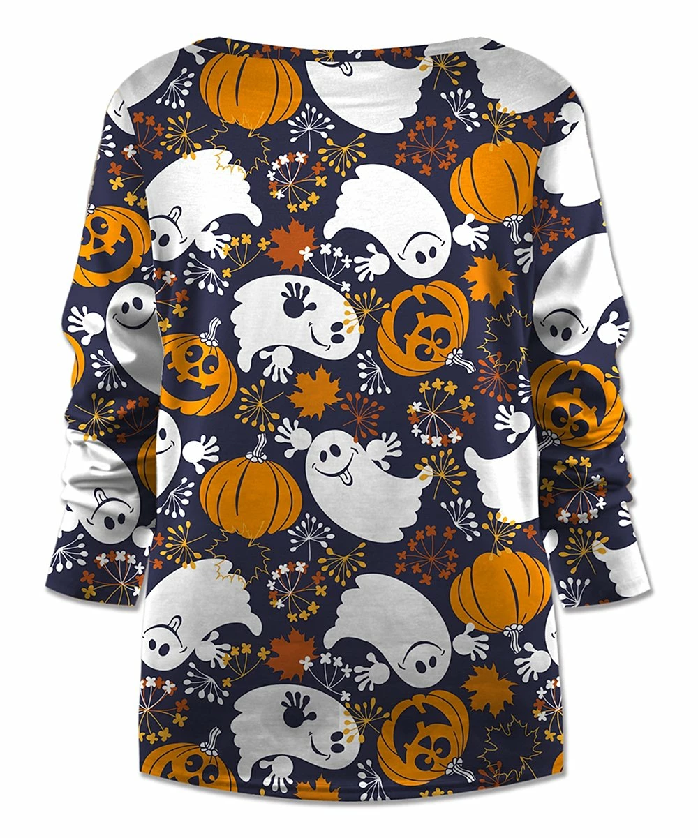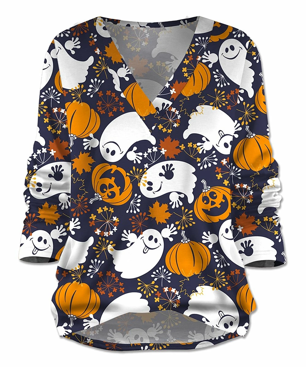Get into the spirit of the season with this colorful top featuring a v-neckline and allover print.