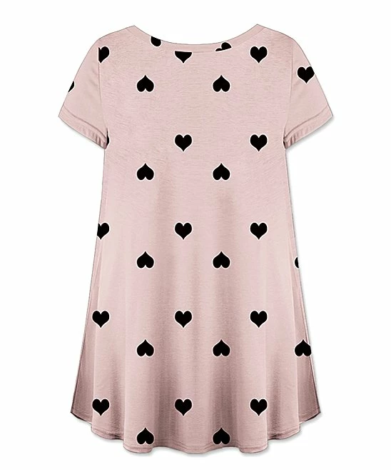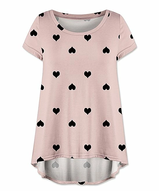 Flow through the day in cheerful fashion when wearing this tunic that combines an allover heart print with a flowy hi-low hemline. Short sleeves deliver cool comfort when temperatures skyrocket.