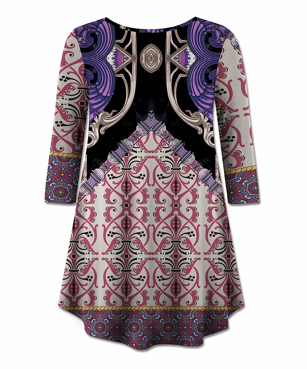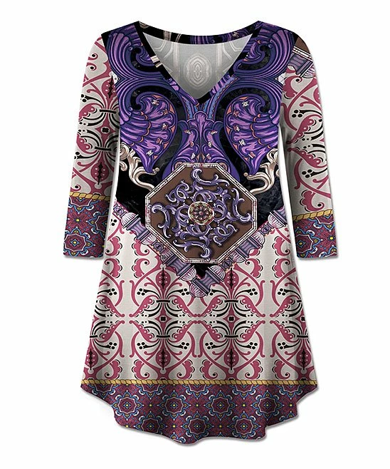 Brightly patterned tunic featuring half-length sleeves and a flattering v-neckline.