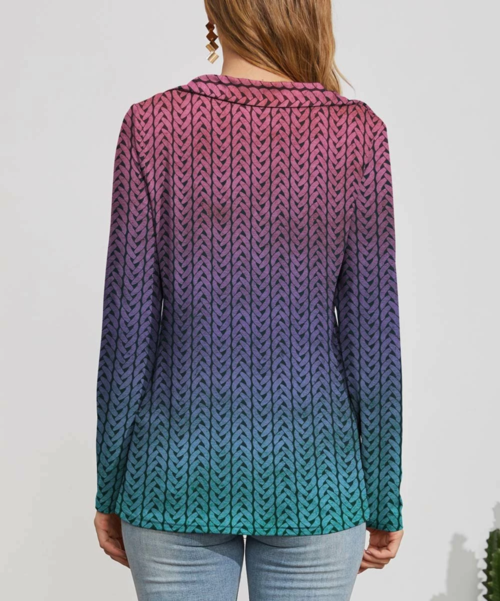 Easygoing long-sleeve top with a collared notch neckline and allover lively print.