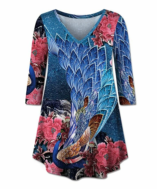 Brightly patterned tunic featuring half-length sleeves and a flattering v-neckline.