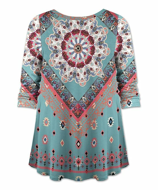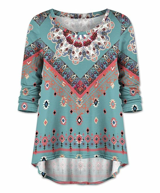 This stretch-infused top features a hi-low hemline and three quarter sleeves.