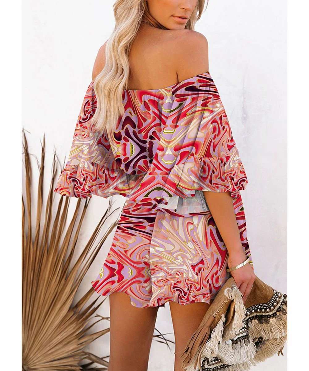 This bold romper features dramatic bell sleeves with ruffle trim and a flattering off-shoulder neckline. Enhanced with stretch for added comfort.