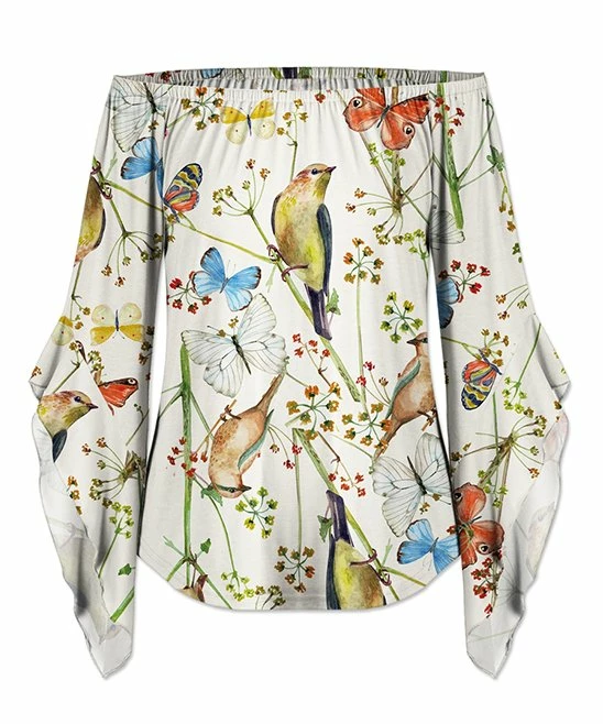 Add a pop of playful print to your look with this off-shoulder top designed with flowing bell sleeves and a hint of stretch.
