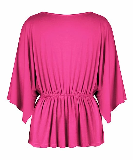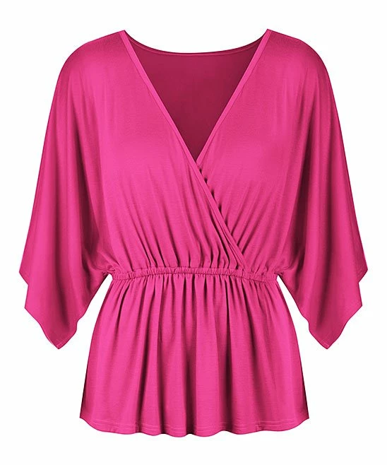 Dress up your casual wardrobe with this solid-hue surplice top featuring flowy cape-sleeve details and a figure-flattering gathered-waist.
