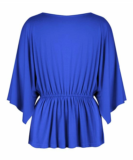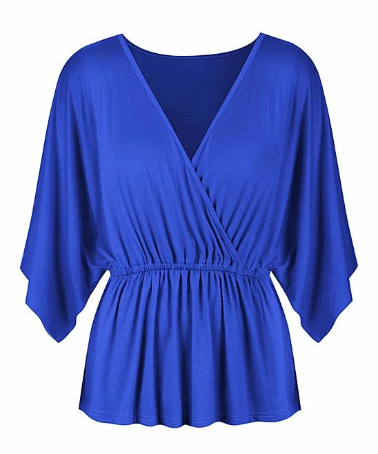 Dress up your casual wardrobe with this solid-hue surplice top featuring flowy cape-sleeve details and a figure-flattering gathered-waist.