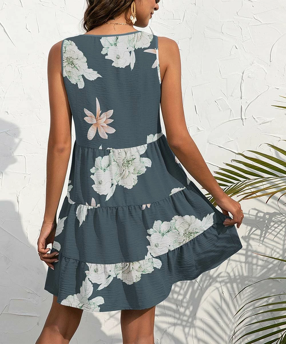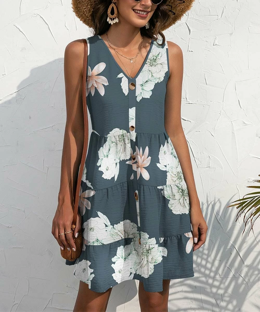 V-neck dress featuring a soothing floral print and a sleeveless design.