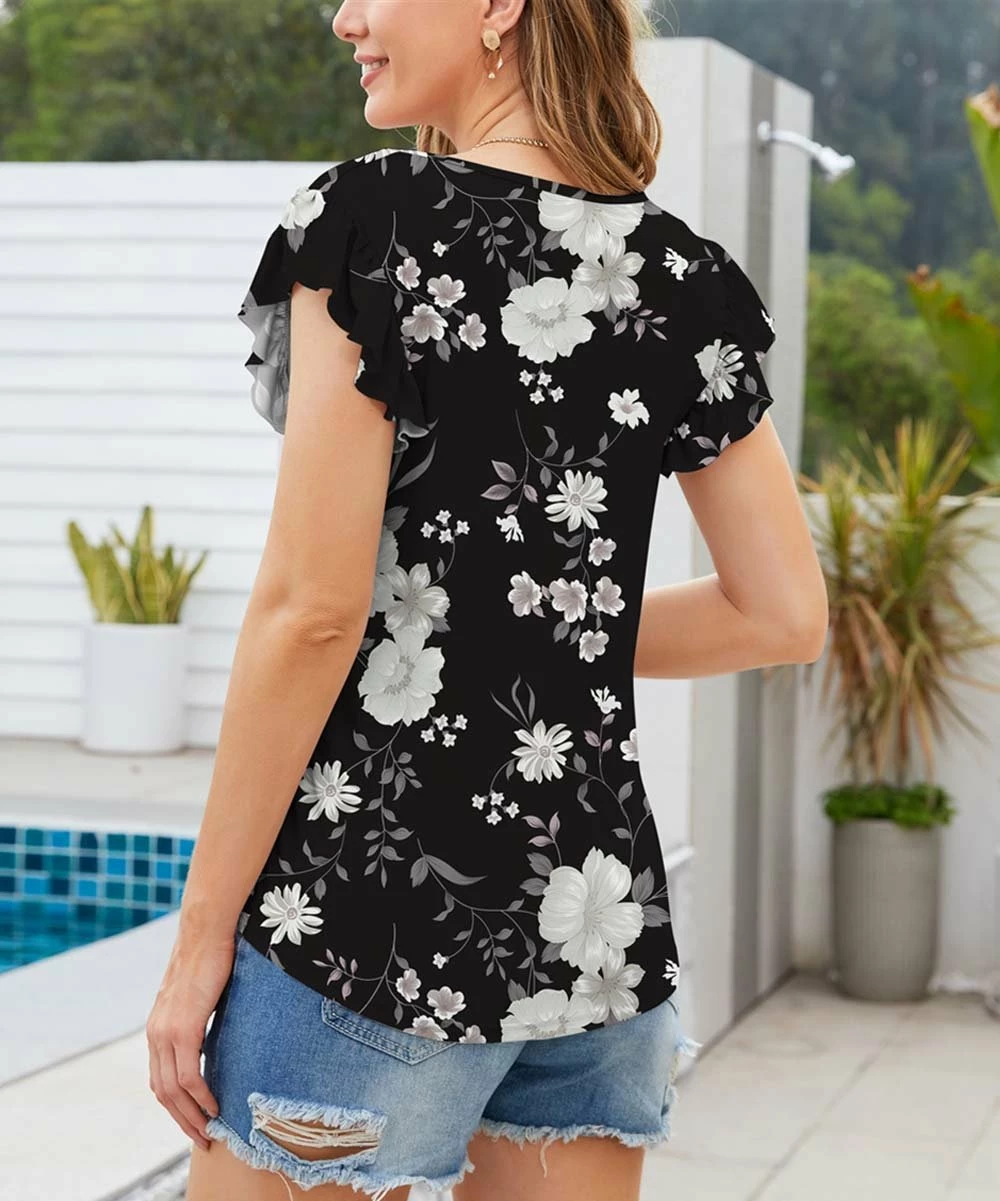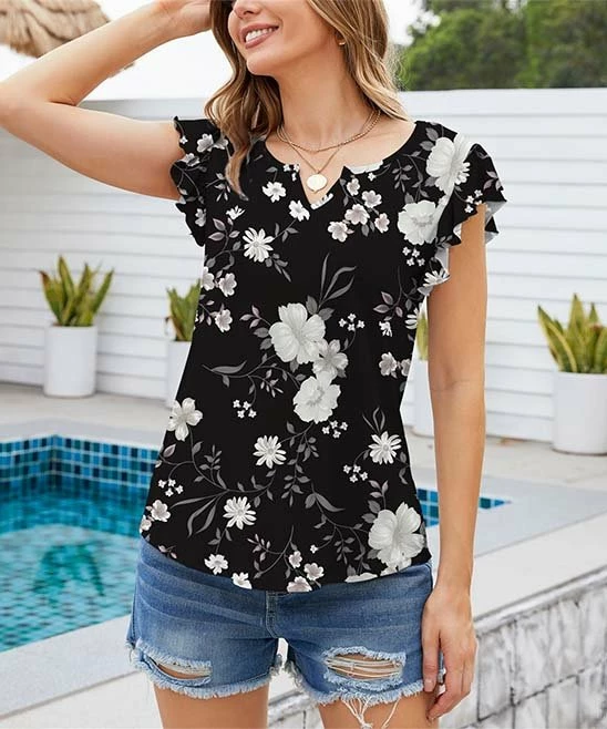 A slight ruffle in the sleeves and notch at the neck accents this better-than-basic printed tee.