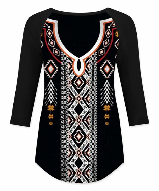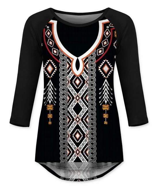 Bring standout style to your casual closet with this patterned raglan top featuring a hint of stretch fabric and flattering curved hemline for comfortable wear that pairs effortlessly with jeans, leggings or joggers.