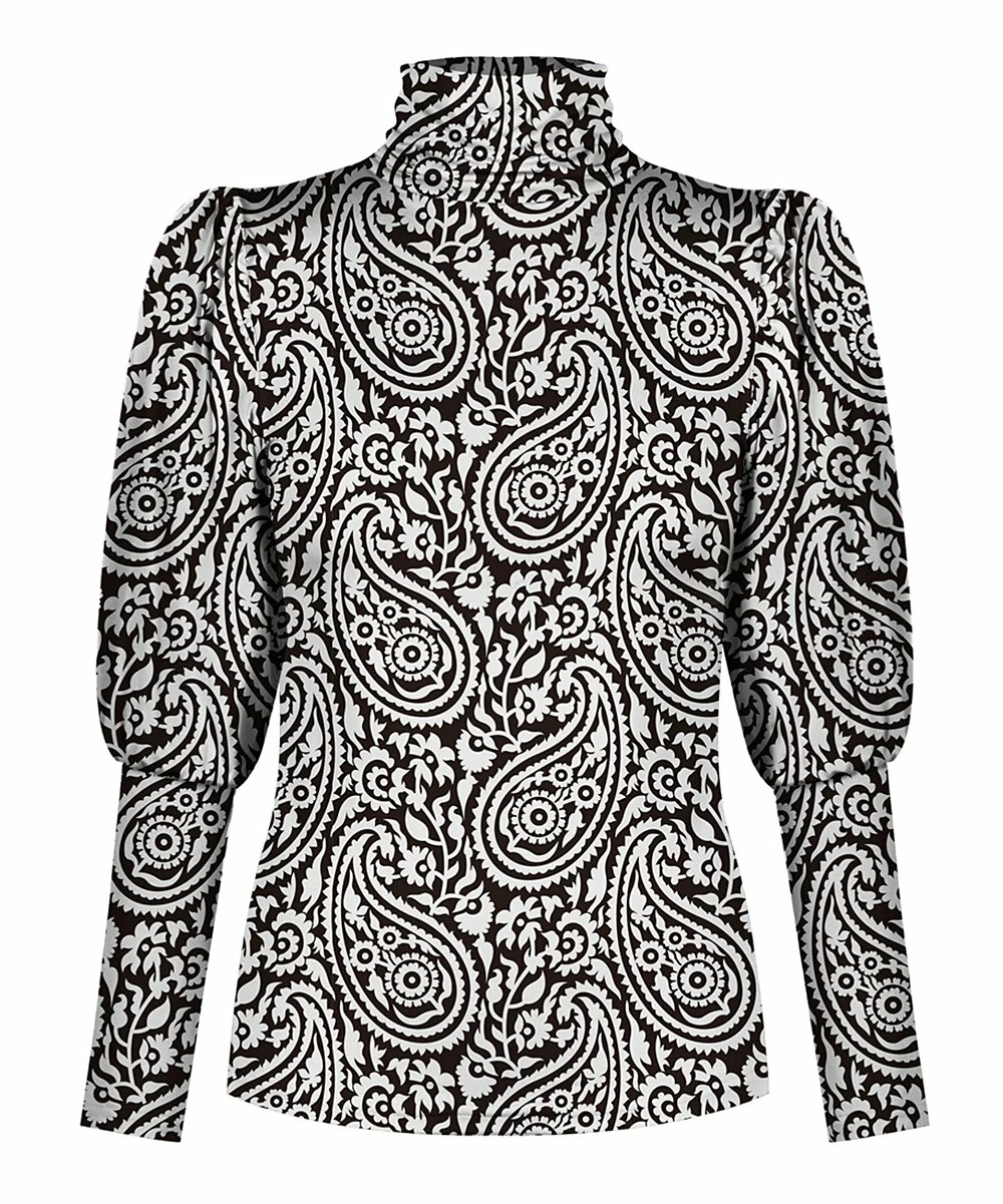 Create a bold new look with help from this eye-catching top boasting a lightweight, stretch-infused fabric and long puff sleeves for daylong cool-weather comfort.