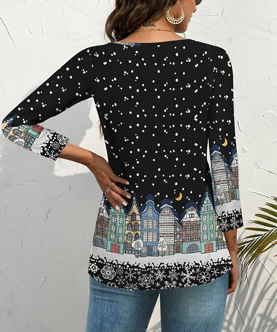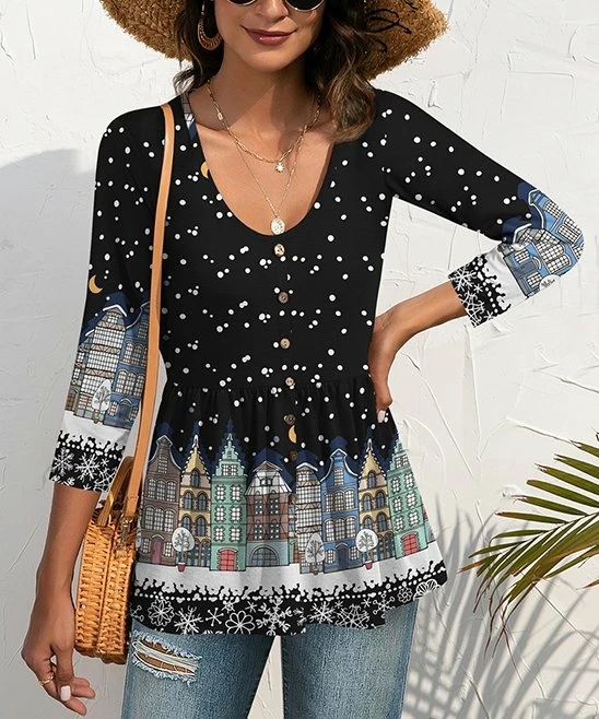 Patterned peplum top featuring a button-front design with a scoop neck and casual three-quarter sleeves.