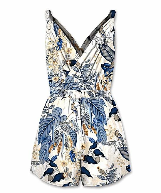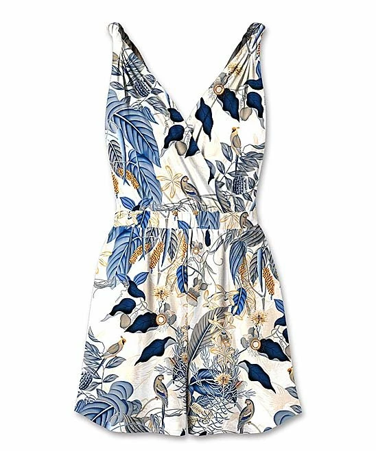 Get ready for sunny days in this sleeveless romper designed with a surplice neckline and a playful print.