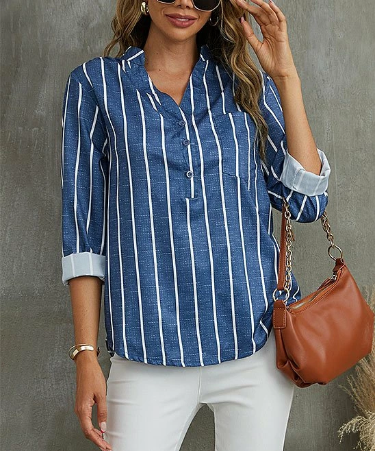 Stripe long-sleeve top featuring a front button placket, a standing collar and a chest pocket detail. Curved hem.