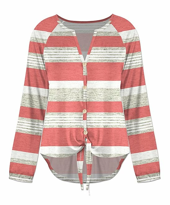 Satisfy your desire for style with this long-sleeve top boasting a button-up design and a hi-low hemline knotted in the front.