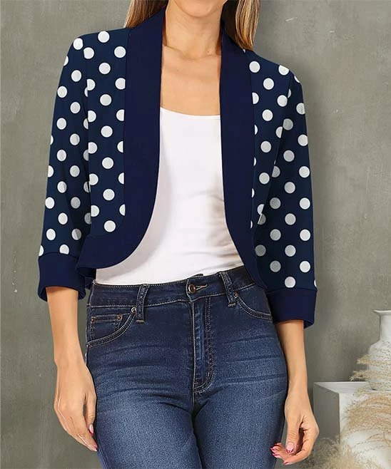 This fun open blazer features a bold print and a crop length for a fresh look over any outfit.
