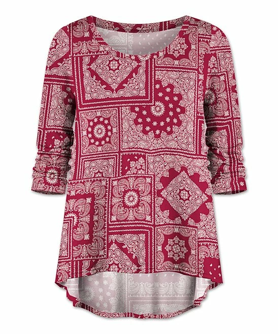 This stretch-infused top features a hi-low hemline and three quarter sleeves.