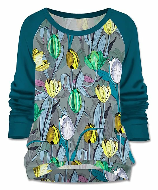Ease through your day in this patterned raglan top featuring stretchy knit fabric and a subtle hi-low hemline for comfortably casual wear that styles seamlessly with jeans or leggings.